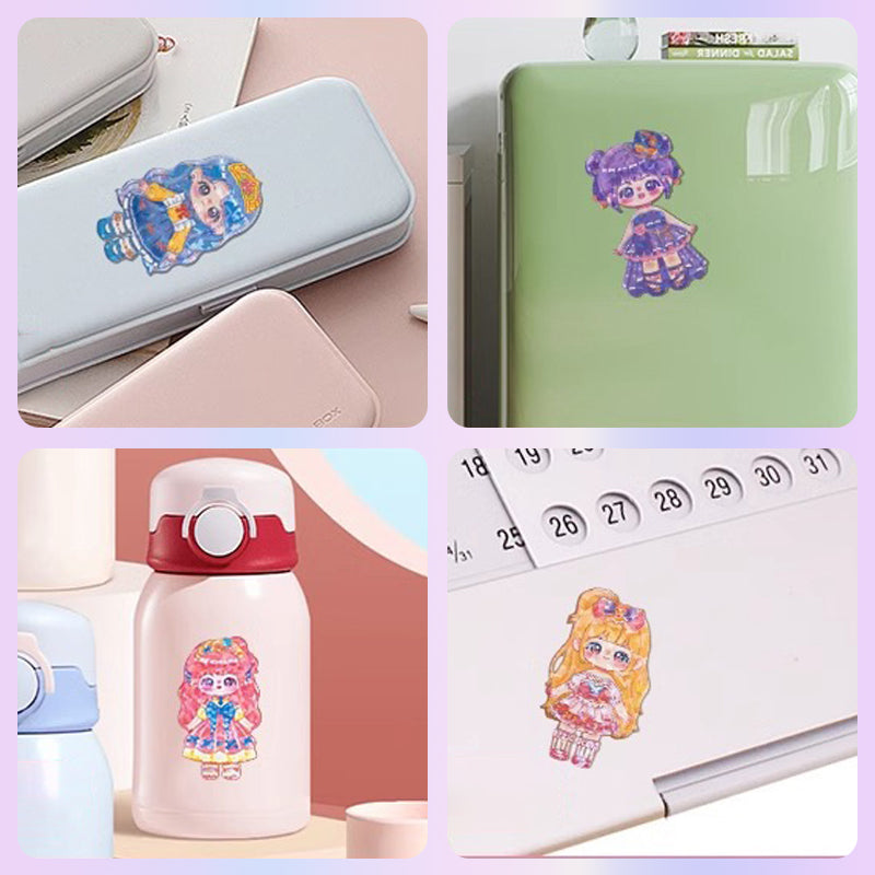 明るく鮮やかで多用途なデザイン:鮮やかな色合いのレーザーコーティング磁石パーツが視覚的な魅力を放ちます。冷蔵庫、筆箱、魔法瓶など様々な表面に貼り付けられる多用途ステッカーで、外出先でも楽しめます。